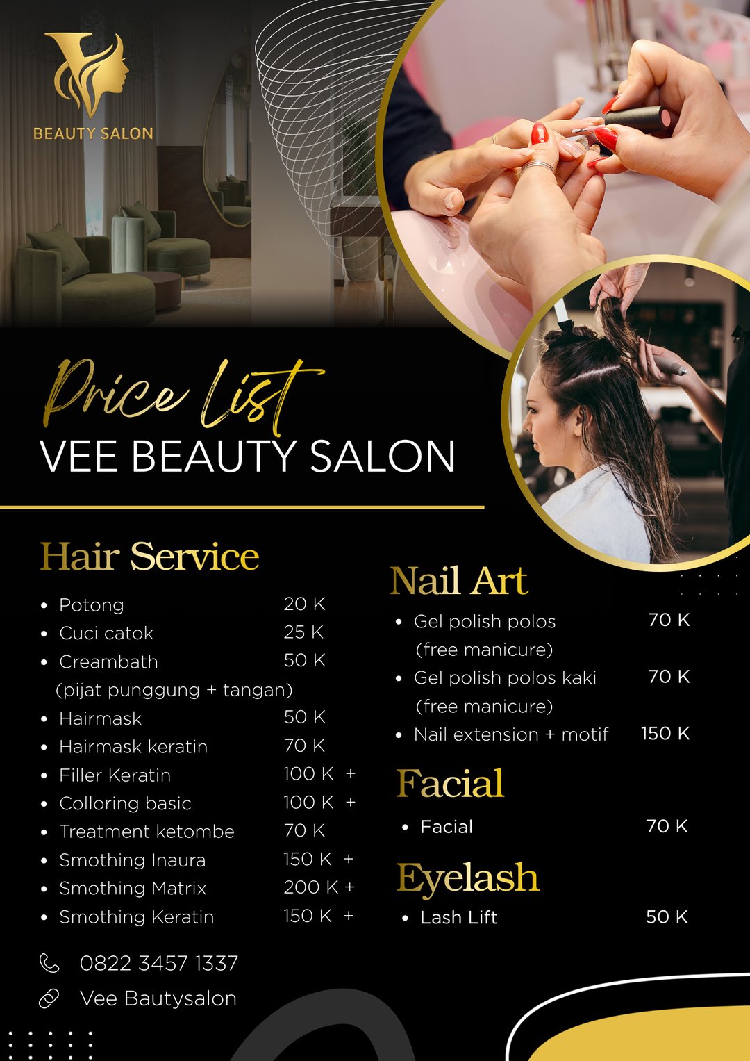 Vee Beauty Salon adalah salon kecantikan terpercaya di Binangun yang menyediakan layanan perawatan rambut, nail art, facial, dan eyelash dengan hasil profesional dan harga terjangkau. Kami melayani potong rambut, cuci catok, creambath dengan pijat punggung & tangan, hairmask, smoothing, coloring, hingga treatment keratin menggunakan produk berkualitas dan ditangani oleh terapis berpengalaman. Selain hair service, Vee Beauty Salon juga menghadirkan nail art & gel polish, facial treatment, serta lash lift untuk menunjang penampilan Anda agar tampil lebih cantik dan percaya diri. Tempat nyaman, bersih, dan pelayanan ramah menjadikan kami pilihan salon favorit di Binangun.